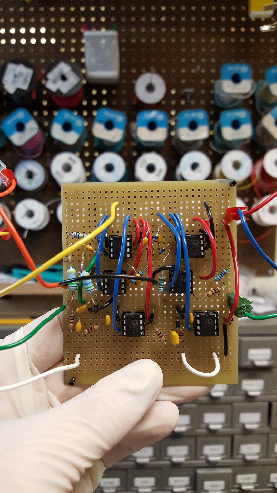 “Spinlab has a dedicated electronics room that allows us to design and build custom electronics that might otherwise not be available commercially. The E-room is outfitted with workbenches, soldering irons, power supplies, a drill press, as well as a plethora of tools and electronic components in stock”During mid-October, I made use of the E-room to build a circuit for a high-priority, time critical experiment. It reads a high-frequency, DC-offset signal input and splits it into two signals. One path filters out the high-frequency. The other path filters out the offset. This effectively separates the Direct Current (DC) signal from the Alternating Current (AC) signal and allows us to read both independently of each other”